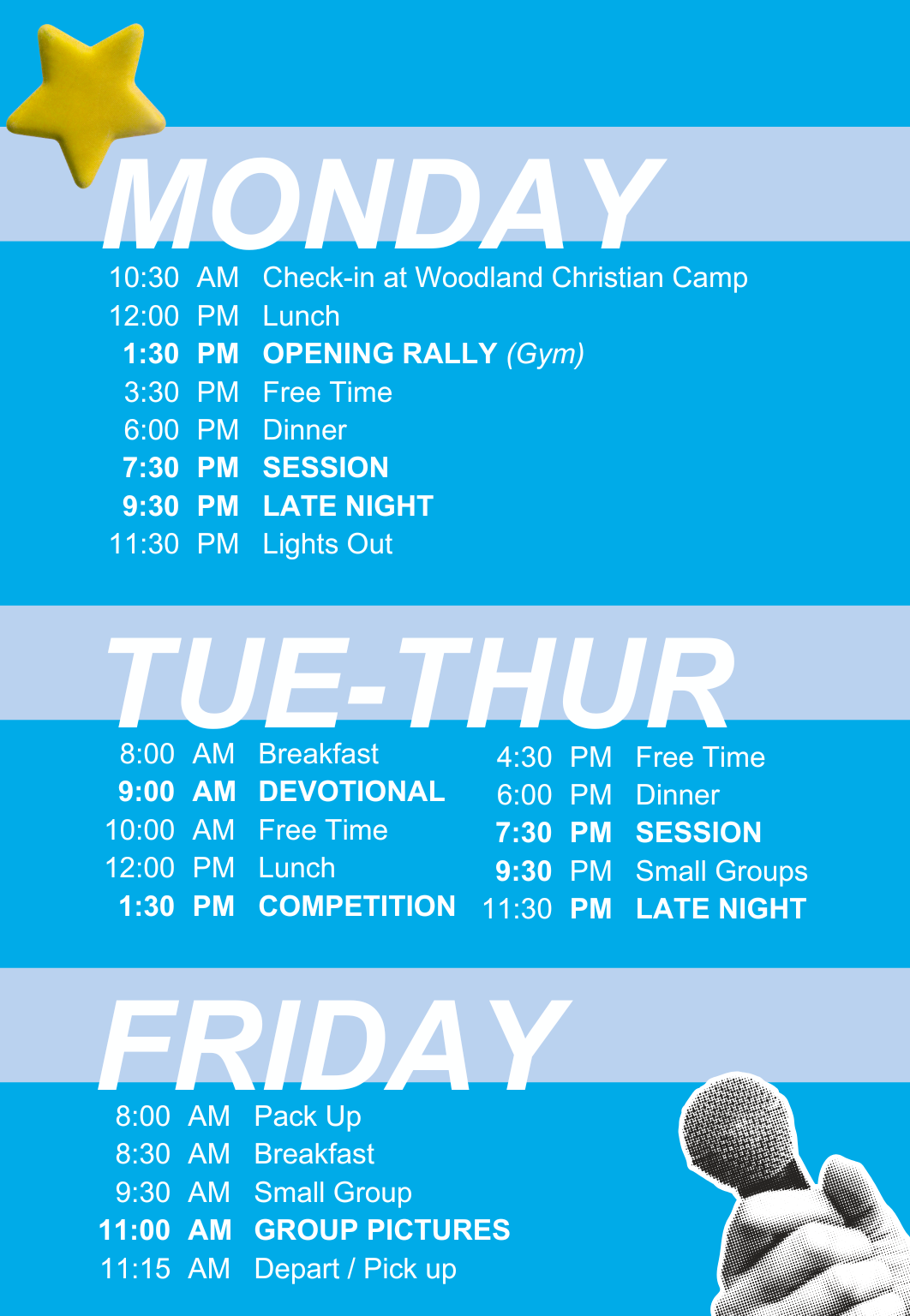 Summer Camp is a five-day, four-night retreat designed to impact students with the Gospel and connect students with each other in a fun and exciting environment. Students will engage in high energy worship, hear large group messages, meet in small group Bible studies, as well as have personal Bible study time. Woodland Christian Camp offers high adventure activities as well as plenty time to relax and hang out with friends.